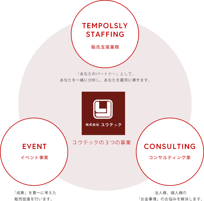 ユウテックは、お仕事をお探しの方、または悩まれている方に対して、単なる仕事の斡旋としてではなく、「皆様を導いていく」という考え方を持っております。